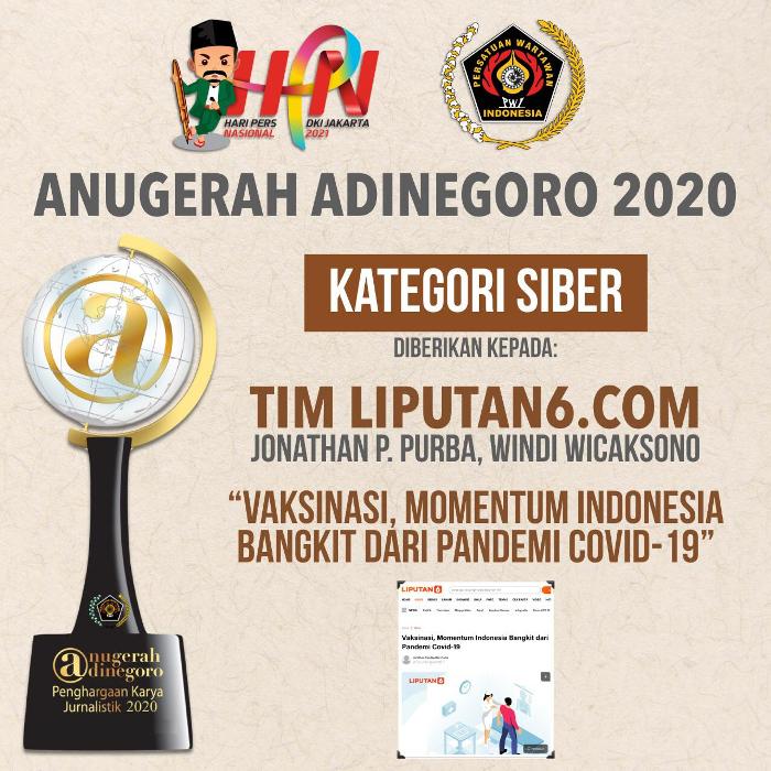 Kategori Media Siber dimenangi Jonathan Pandapotan Purba dan Windi Wicaksono dari Liputan6.com berjudul “Vaksinasi, Momentum Indonesia Bangkit dari Pandemi COVID-19” yang diterbitkan 23 Oktober 2020.