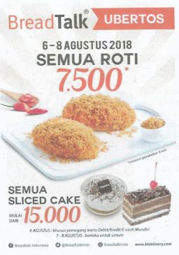 Untuk menyambut outlet terbaru di Mall Ubertos ini, BreadTalk Indonesia pada tanggal 5-8 Agustus 2018 kembali memberikan harga spesial untuk semua roti dan sliced cake yang dlsajlkan.