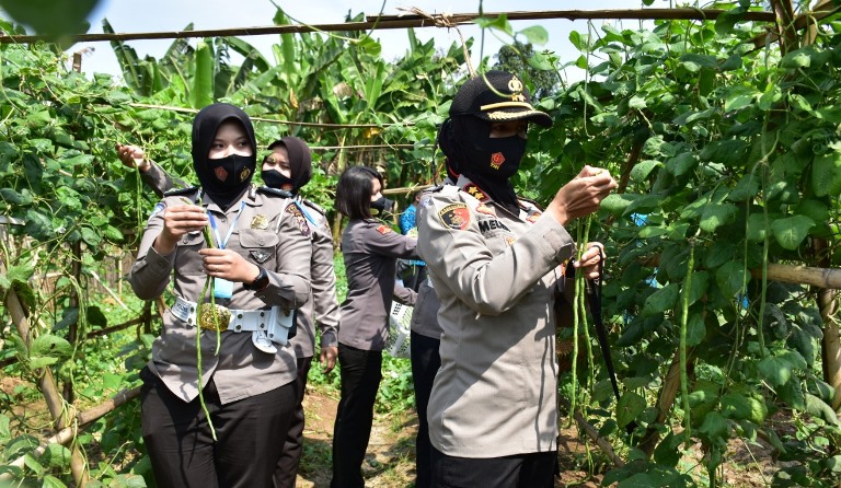 Banjar, sebelas12.com – Kapolres Banjar AKBP Melda Yanny, S.Ik, MH, bersama Personil Polwan Polres Banjar Polda Jabar, Ketua dan Pengurus Bhayangkari Cabang Banjar, serta Ketua dan Anggota Penggerak PKK Kota Banjar safari perkebunan KWT dan UMKM yakni Kelompok Wanita Tani (KWT) Melon, Kelompok Wanita Tani (KWT) Kenanga, Kelompok Tani Tunas dan UMK Home Industri Karisma dalam rangka meningkatkan ketahanan pangan di masa Pandemi Covid-19 jelang Adaptasi Kebiasaan Baru (AKB) di wilayah Desa Raharja Kec. Purwaharja Kota Banjar. Kamis (6/8/2020).